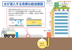 さらに驚いたのが給油配管内で結露が生じるというお粗末です。その燃料給油施設は地下に貯めた航空燃料をポンプでくみ上げ屋上着陸帯脇の払出しユニットからヘリコプターへ給油するというものでした。本来ならタンクローリー車が地下タンク脇に停まりタンクへ航空燃料を注入するのですが、地下タンクの脇に十分なタンクローリーエリアがないために地上を100m以上横樋の中を流すという仕組みなのです。「アホかいな!」私は驚きました。