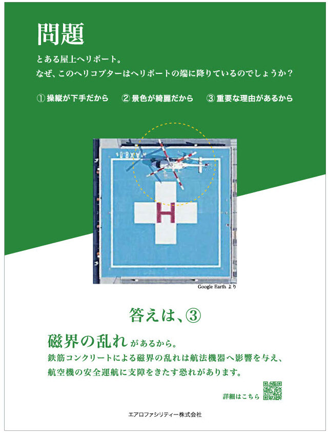 能登半島地震では、陸路が遮断される中でヘリコプターやドローンが活躍し、「空路」の有効性が改めて確認されました。その一方で、病院の屋上ヘリポートや緊急離着陸場は鉄筋コンクリート(RC)で構築されていることが多く、鉄筋の磁化による「磁界の乱れ」が機体の磁気センサーや航法に影響を与える懸念が指摘されています。磁界調査レポート(下記参照)が示すように、磁界偏差が90度を超えるようなヘリポートもあり、ドクターヘリの運航に支障を来たしている現状があります。将来の自律運航ドローン/eVTOLの受け入れを見据えても、ヘリポートの非磁性化は喫緊の課題です。本稿では、医療施設の視点からその解決策と設計のあり方を整理します。