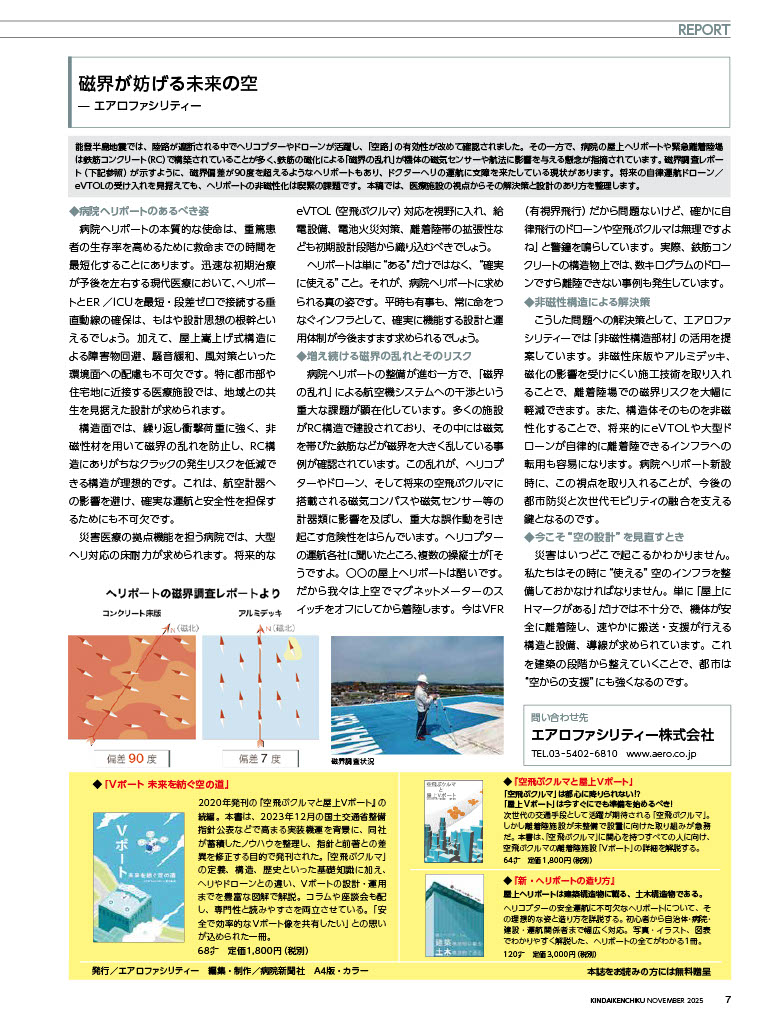 こうした問題への解決策として、エアロファシリティーでは「非磁性構造部材」の活用を提案しています。非磁性床版やアルミデッキ、磁化の影響を受けにくい施工技術を取り入れることで、離着陸場での磁界リスクを大幅に軽減できます。また、構造体そのものを非磁性化することで、将来的にeVTOLや大型ドローンが自律的に離着陸できるインフラへの転用も容易になります。病院ヘリポート新設時に、この視点を取り入れることが、今後の都市防災と次世代モビリティの融合を支える鍵となるのです。