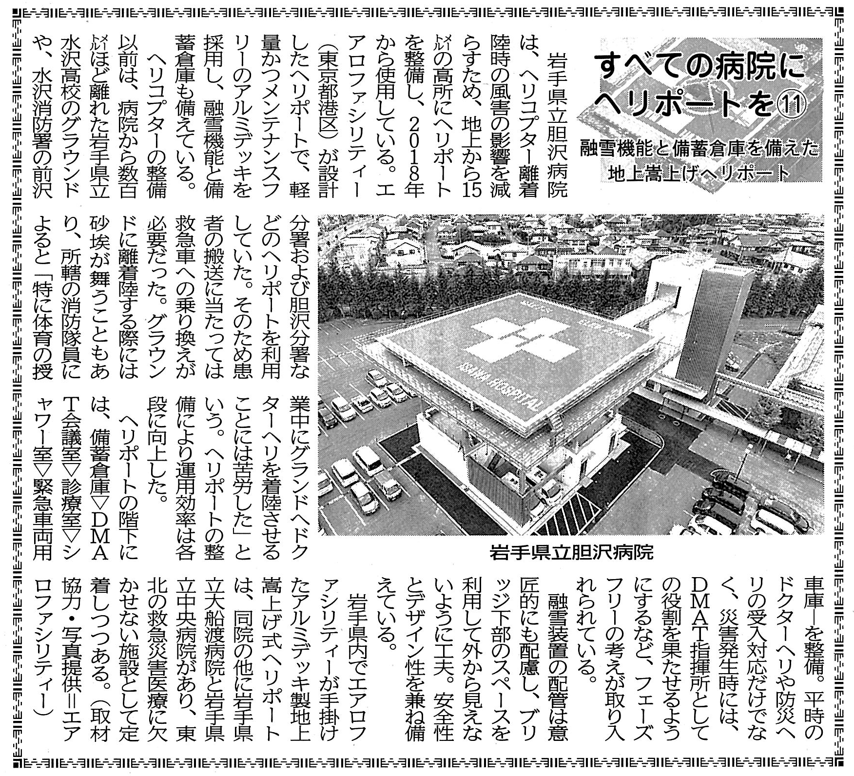 岩手県立胆沢病院は、ヘリコプター離着陸時の風害の影響を減らすため、地上から15メートルの高所にヘリポートを整備し、2018年から使用している。エアロファシリティー(東京都港区)が設計したヘリポートで、軽量かつメンテナンスフリーのアルミデッキを採用し、融雪機能と備蓄倉庫も備えている。